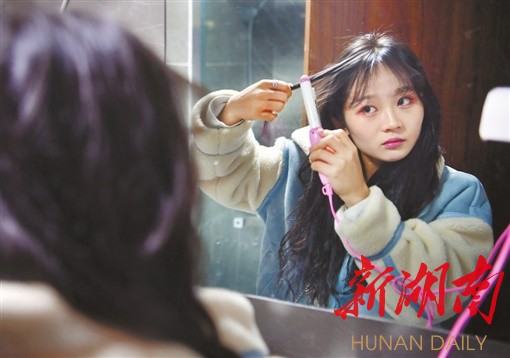 3月5日6时28分,穿版模特莎莎在公寓里化妆。美妆是她们的“标配”。