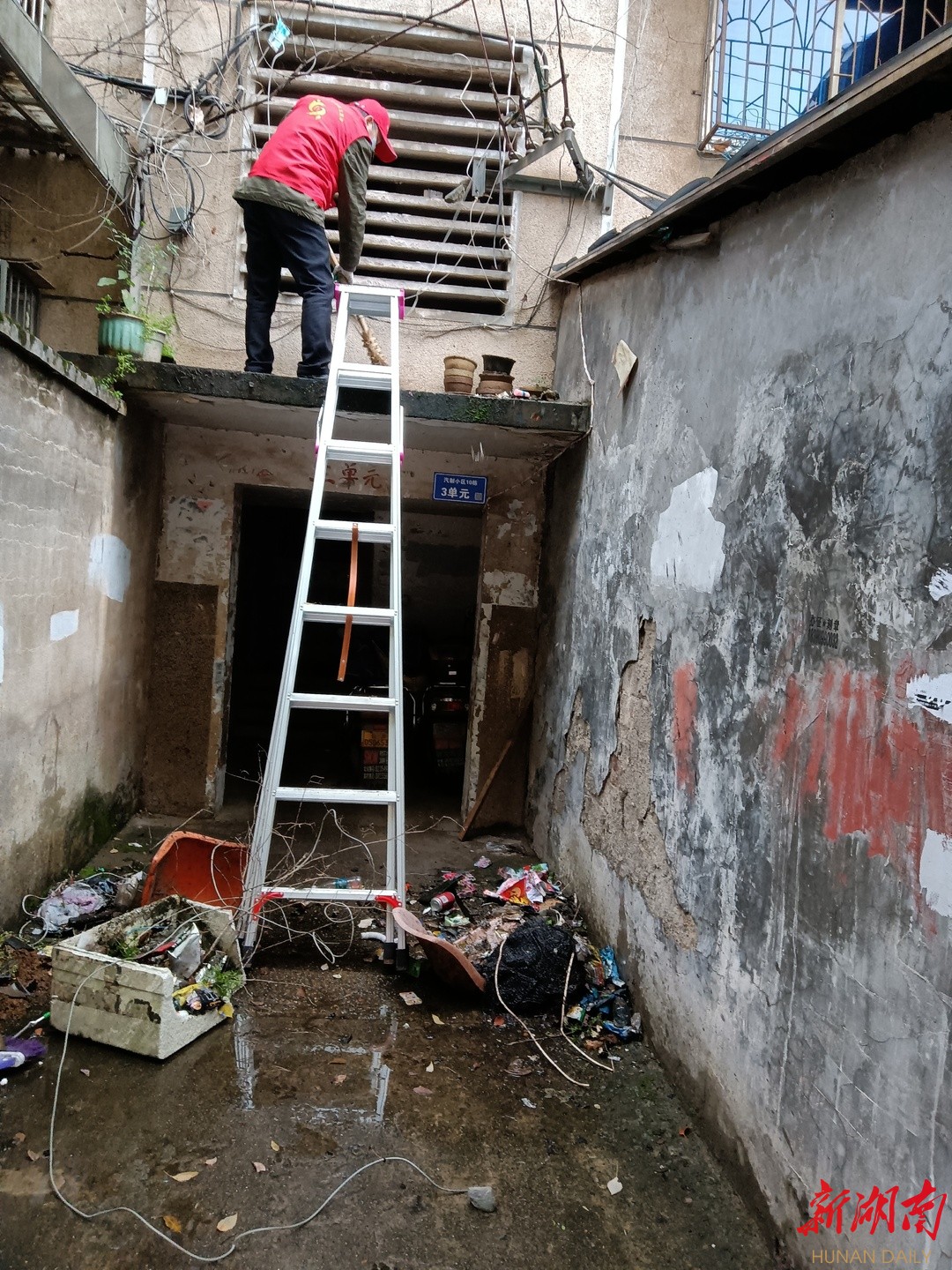 现场,志愿者们冒雨架梯爬楼整理单元预制板杂物、清理死角、补栽绿植、搬运废弃堆物、修补花坛、铲除“牛皮癣”、粉刷墙壁、清除沟渠……一刻也不停歇。虽然这两天风雨交加,最高气温仅10摄氏度,但他们脸颊上、背上却早已浸出了汗水。近80岁的老党员王娭毑也全程参与此次行动。“社区组织大家来搞大扫除了,为了大家共同的家园,都来搭把手咯……”王娭毑一边嘱咐志愿者们注意安全,一边吆喝居民共同参与整治行动,“洁净家园既要突击,又要常态保持,更要靠大家自觉遵守,动动手脚,松松筋骨,家园更美了。”