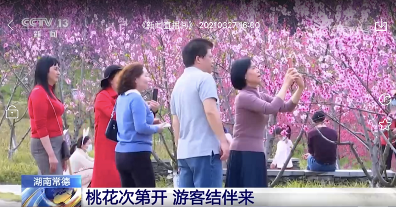 3月29日早上7点,央视国际频道CCTV-4《中国新闻》栏目以“湖南常德:桃花源里满目春”为主题报道桃花源万亩桃林春日美景。3月27日,央视新闻频道CCTV-13《新闻直播间》栏目以“桃花次第开 游客结伴来”为主题大力推介湖南常德桃花源旅游区万亩桃林的花开景象。