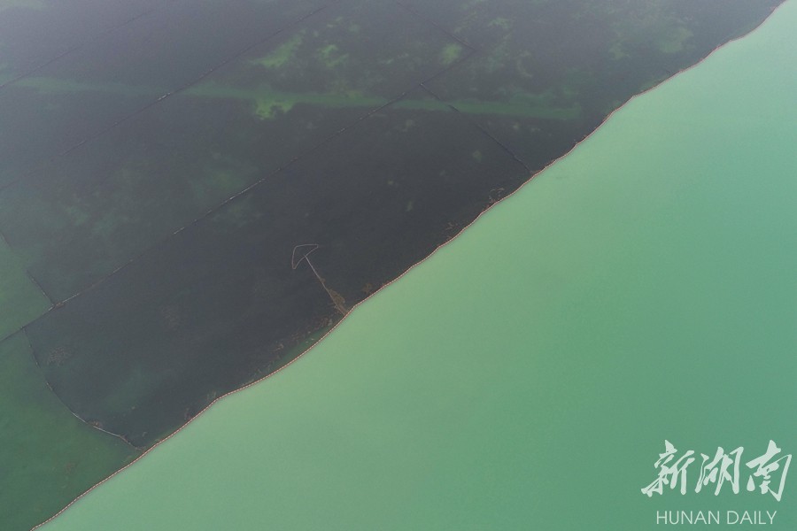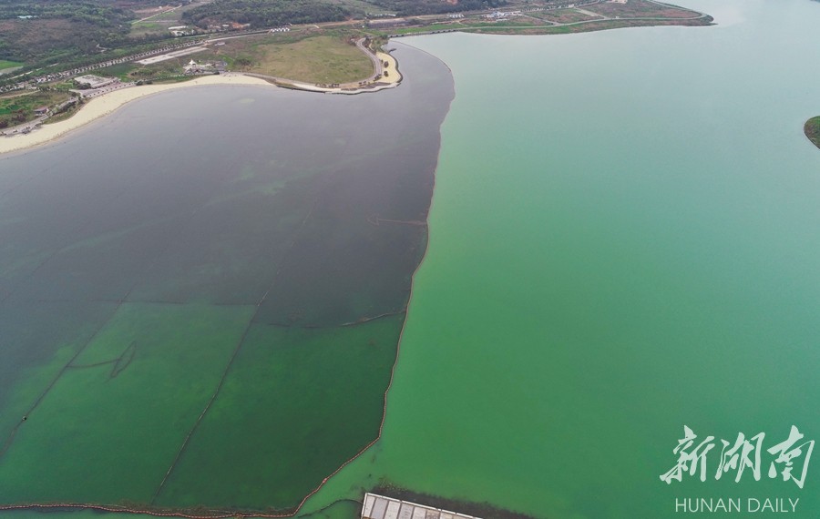 3月27日,长沙县松雅湖国家湿地公园泾渭分明的水面,其中,深色为水生态修复试点区域。近年来,长沙县在松雅湖湖区打造总面积为49万平方米的3个水生态修复试点区域,通过种植苦草、黑藻、狐尾草,投放食藻虫、鱼类、螺等措施,优化植物群落及水生动物,构建完善的水生态系统,使水体逐步获得持续的自净能力。目前,试点区域水体透明度明显改善,水质明显提升。 湖南日报 ·新湖南客户端 记者 童迪 摄