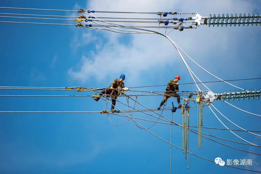 ■ 2020年4月24日,电力工人在高空中行走,如同上演一场空中“芭蕾”。