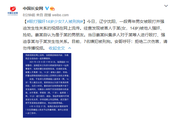 沈阳警方通报14岁少女被强奸:已刑拘7名嫌犯