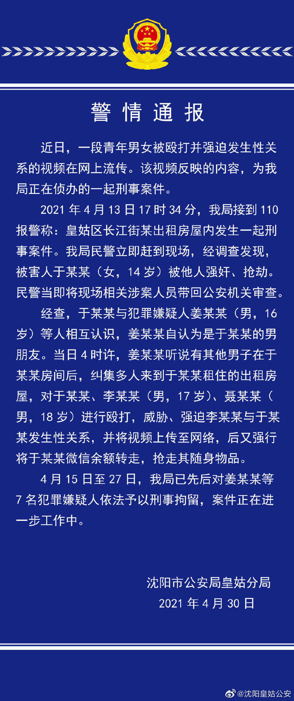 今日,辽宁沈阳,一段青年男女被殴打并强迫发生性关系的视频在网上流传。经查发现被害人于某(女,14岁)被他人强奸、抢劫。姜某自认为是于某的男朋友。当日姜某纠集多人对于某等人进行殴打、强迫李某与于某发生性关系。目前,7名嫌犯被刑拘。