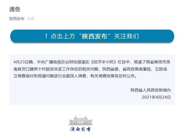 陕西发布消息:4月23日晚,中央广播电视总台财经频道在《经济半小时》栏目中,报道了我省商洛市洛南县灵口镇两个村脱贫攻坚工作存在的相关问题,陕西省委、省政府高度重视,立即成立调查组对所报道问题进行全面深入调查,有关调查结果将及时公布。