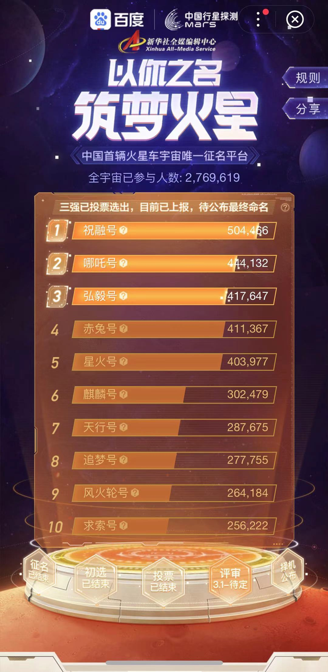 此前,在中国首辆火星车全球征名活动公众网络投票活动中,“祝融号”以超50万的选票荣登榜首。