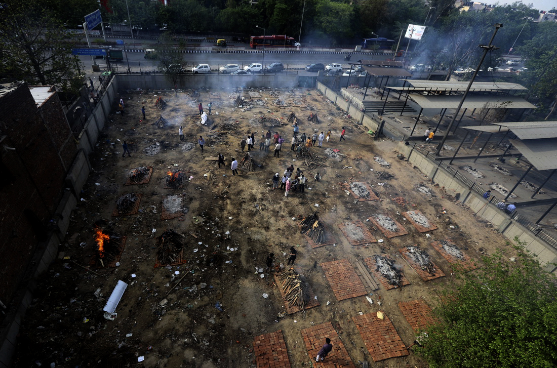 当地时间2021年4月21日,印度新德里,新冠患者的遗体在一块被改造成火葬场的空地上焚烧。