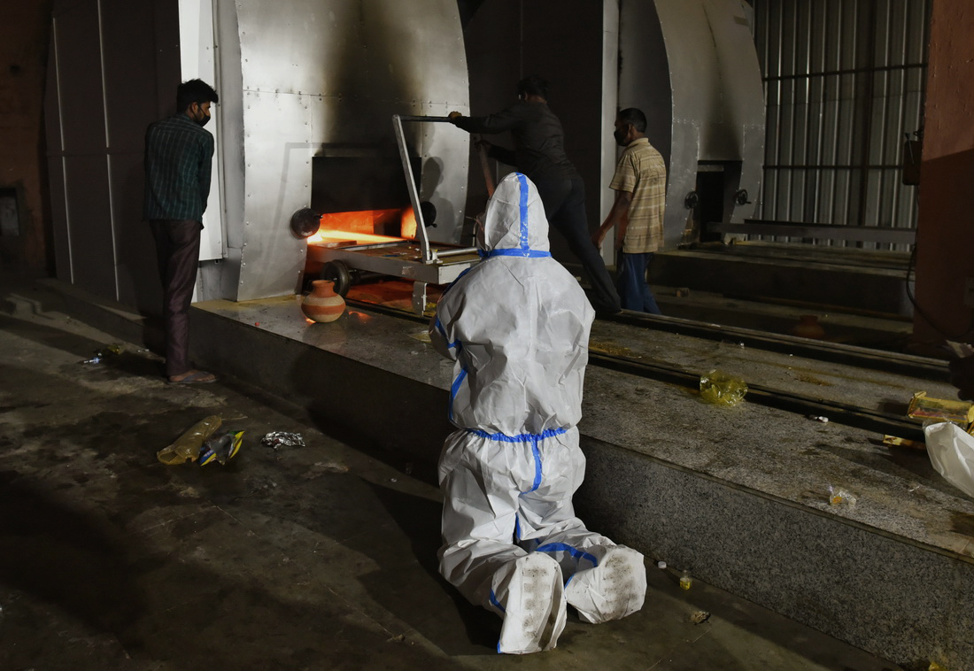 当地时间2021年4月19日,印度新德里,死者家属在火葬场送别亲人。