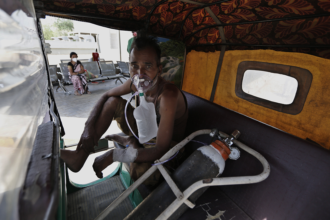 当地时间2021年4月22日,印度艾哈迈达巴德,一名新冠患者正在车内吸着氧气等待接受治疗。