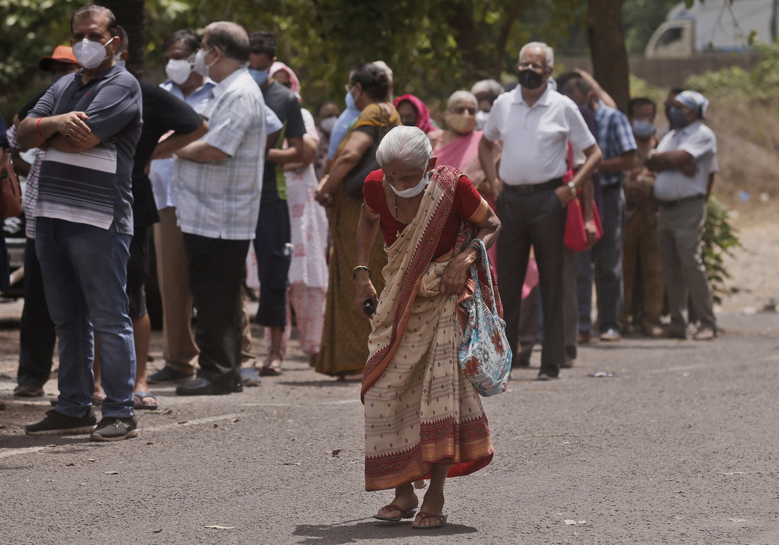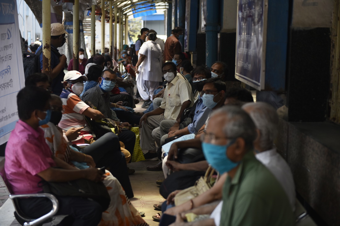 当地时间2021年4月20日,印度加尔各答,人们在政府医院等待接种新冠疫苗。