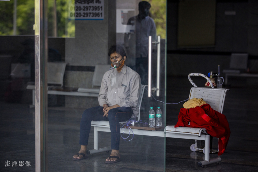 当地时间2021年4月21日,印度新德里郊区诺伊达,一名戴着氧气面罩的新冠患者目光呆滞地坐在医院长椅上。