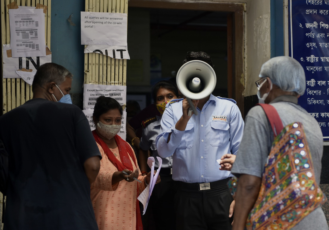 当地时间2021年4月20日,印度加尔各答,一处新冠疫苗接种点,保安用扩音器呼叫接种者的号码。