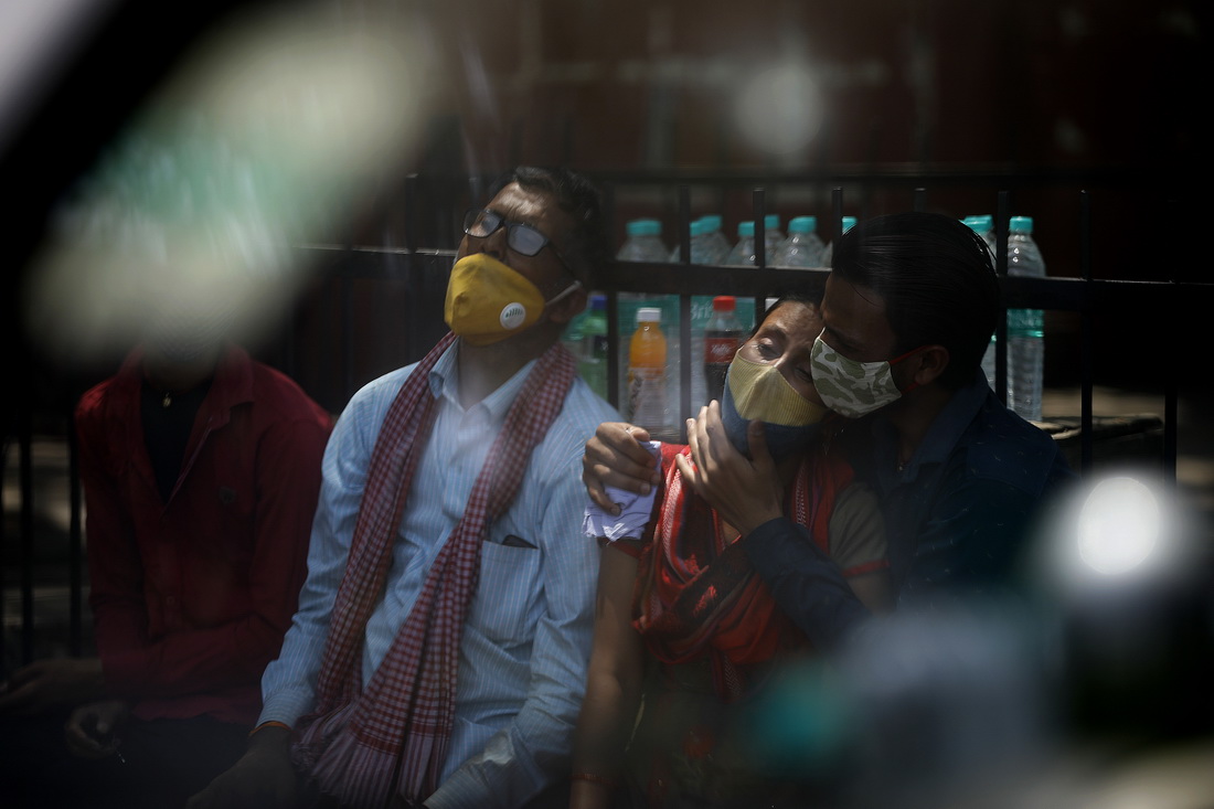 当地时间2021年4月21日,印度新德里一家医院外,家属边等待边安慰不幸感染新冠病毒的家人。