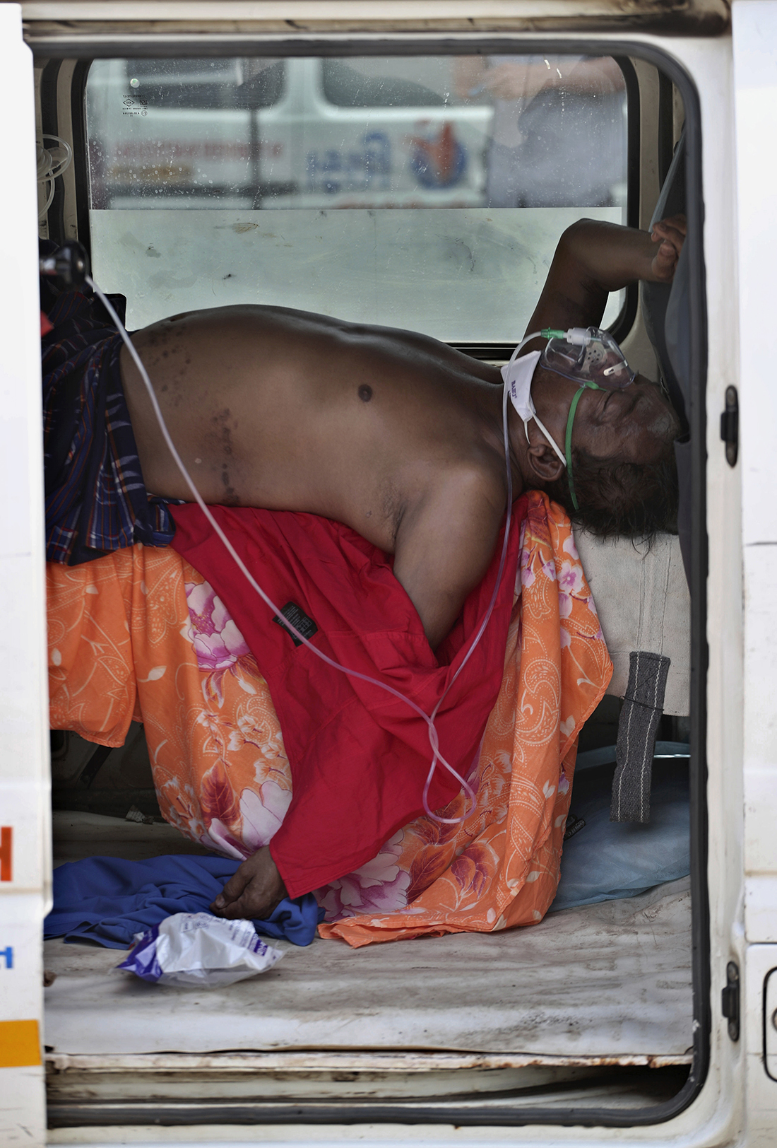 当地时间2021年4月21日,戴着氧气面罩的新冠患者在印度新德里郊区的一家医院内等候。