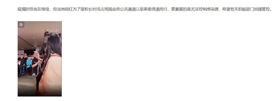 “疫情防控尚在继续,当地网红为了吸粉长时间占用国金公共通道以至乘客绕行,希望有关职能部门加强监控。”