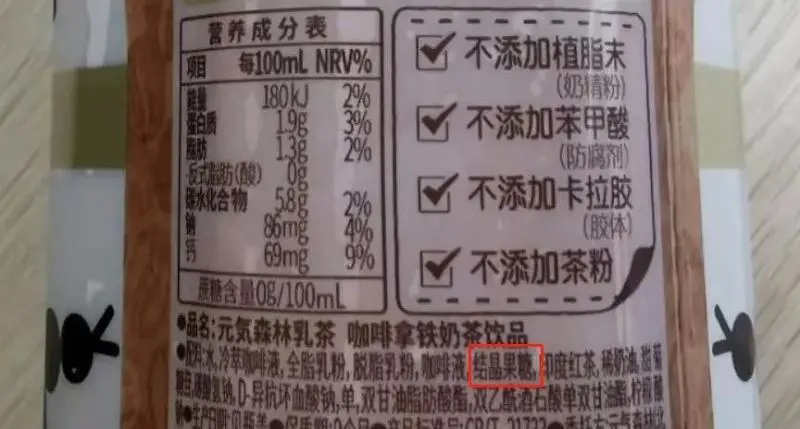 记者查看元气森林饮料产品的营养成分表和配料表发现,此次致歉声明中提到的乳茶产品在“升级”前添加了结晶果糖。而结晶果糖并不是“代糖”,它就是货真价实的糖。此前元气森林乳茶产品宣称“0蔗糖”,很容易让人误解为“无糖”,这就是在误导消费者。
