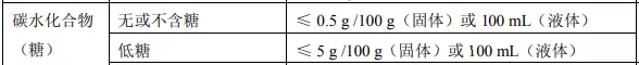 据《食品安全国家标准预包装食品营养标签通则》的要求,如果某食品标注“低糖”,则每100g/ml中的碳水化合物(糖)含量≤5克;如果标注“无糖”则要求更高,每100g/ml中碳水化合物(糖)含量≤0.5克。