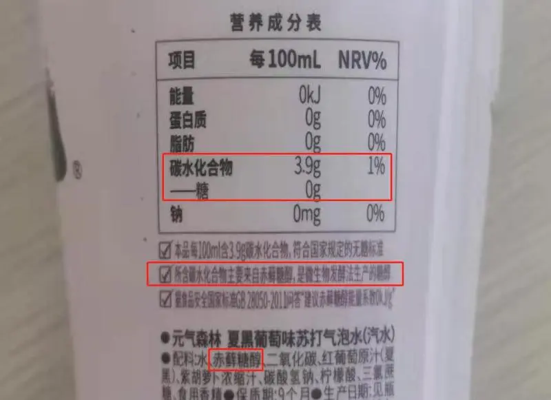 而元气森林苏打气泡水的营养成分表则显示,每100ml饮料中含糖0g,含碳水化合物3.9g,饮料中所含的碳水化合物主要来自赤藓糖醇。