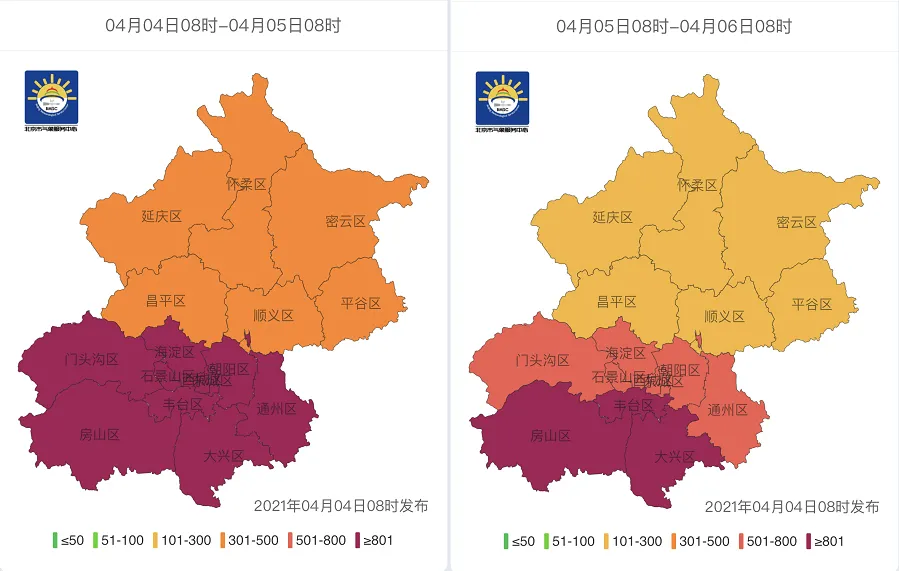 ◆ 4月4日、5日,北京市气象台监测显示,北京市花粉平均浓度等级很高,花粉致敏性很高,其中南部区域处于极高水平(≥801),花粉过敏的小伙伴们可要注意了!