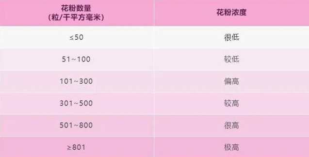 花粉浓度是指花粉在空气中每1000mm²(平方毫米)所含的花粉粒数。预报如大于400粒/1000mm²,表明花粉浓度已经达到了一定高度,花粉过敏的患者无论轻重,都应注意。