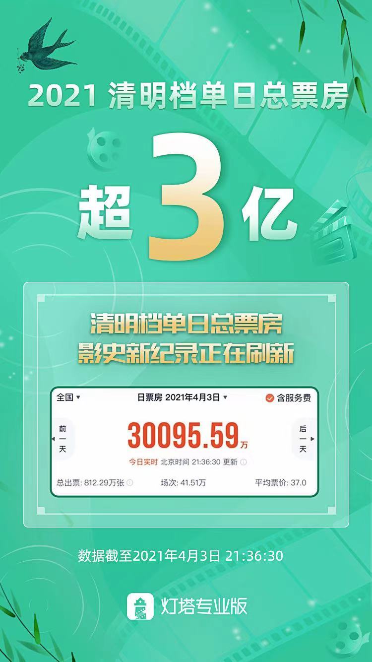 4月3日,据灯塔实时数据,截至今日21时36分,2021清明档单日大盘突破3亿元,刷新清明档单日票房影史最高纪录。