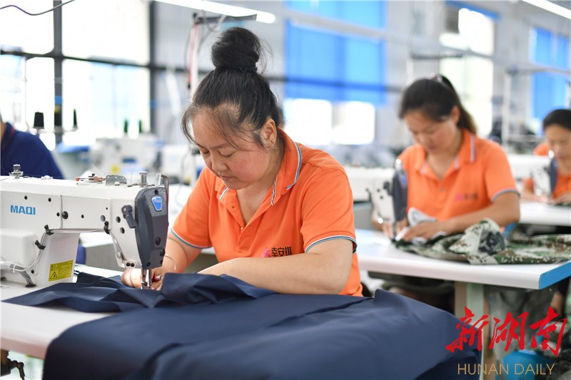 2020年7月24日,工人在湖南十八洞幸安祺服饰有限公司车间内认真缝制服装。目前该公司吸收了建档立卡户和安置点搬迁户34人就业,人均月收入约为2500元。龙恩泽 摄
