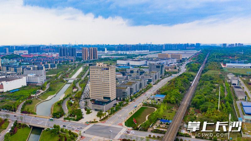 长株潭融城产业最“前线”的雨花经开区,一列高铁从机器人产业片区驶过。