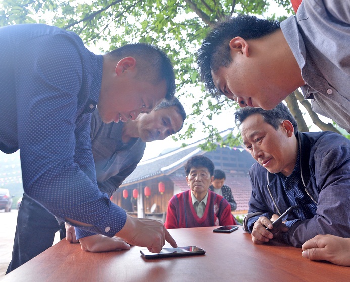 (2020年4月26日,泸溪县武溪镇红岩村,驻村帮扶工作队队员与村民通过手机里的规划图谋划村寨发展。近年,省民政厅驻村帮扶工作队积极改善基础设施、人居环境和生产生活条件,夯实发展基础 。湖南日报·新湖南客户端记者 李健 摄)