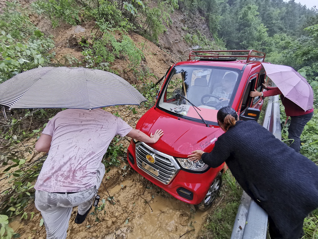 (2020年5月3日,溆浦县普降暴雨,造成双井镇一山体滑坡,伍家湾村一村民的电动车行驶途中被困。双井镇驻村帮扶工作队队员冒雨将车从泥泞中推出。湖南日报·新湖南客户端记者 辜鹏博 摄)