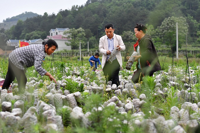 (2020年5月7日,凤凰县千工坪镇胜花村黑木耳产业基地,驻村帮扶工作队队长田洪贵(右二)在指导村民采收黑木耳。湖南日报·新湖南客户端首席记者 郭立亮 摄)