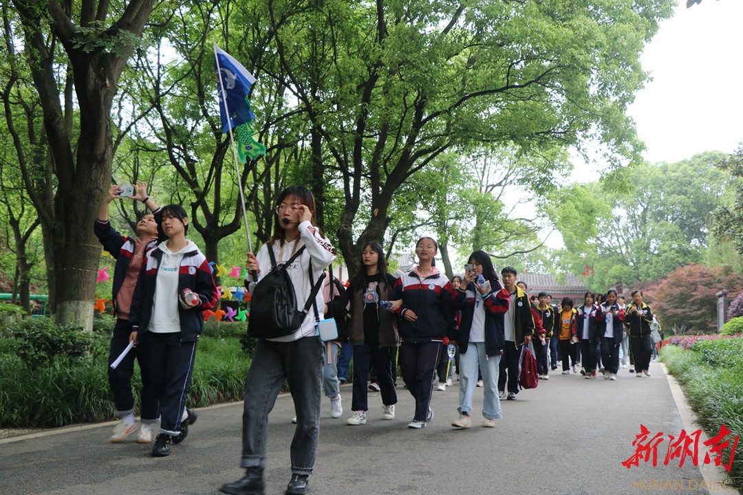 君山岛上,参天古木、茂林修竹,杨柳依依,玫瑰花绽,风景迷人。文学社社员们拜谒洞庭庙、湘妃祠,瞻仰二妃墓、柳毅井,敲飞来钟,赏斑竹,观鱼映水中。在岳阳楼景区,观五朝楼,赏书法碑廊,拜双公祠,品范仲淹、滕子京故事,大家不禁吟诵起《岳阳楼记》,用心品味文化内涵。参观吕仙祠、小乔墓,对洞庭湖的波澜壮阔和岳阳楼厚重的文化底蕴,有了更清晰的了解,大家随带的笔记本上,记满了密密麻麻的文字,用笔“画”出湖湘之美。