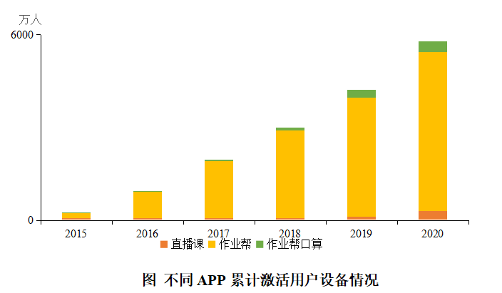 2015年至2020年,作业帮产品在河北省累计激活用户设备数年平均增长105.78%,截至2020年,累计激活用户设备超5000万。其中作业帮APP的累计激活用户设备在2016、2017年迎来增长高峰期,较前一年分别增长445.52%和116.82%;作业帮直播课APP累计激活用户设备在2019年、2020年分别增长155.85%、173.90%。