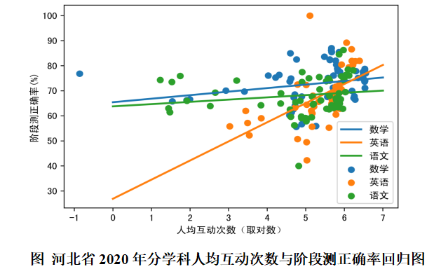 报告显示,语文、数学和英语的人均互动次数与阶段测正确率呈现显著的正相关关系。对于高中学段而言,学生的课堂互动次数对于阶段测成绩正确率有着显著影响。学生互动平均次数每增加1次,则阶段测的成绩提升2.740分。