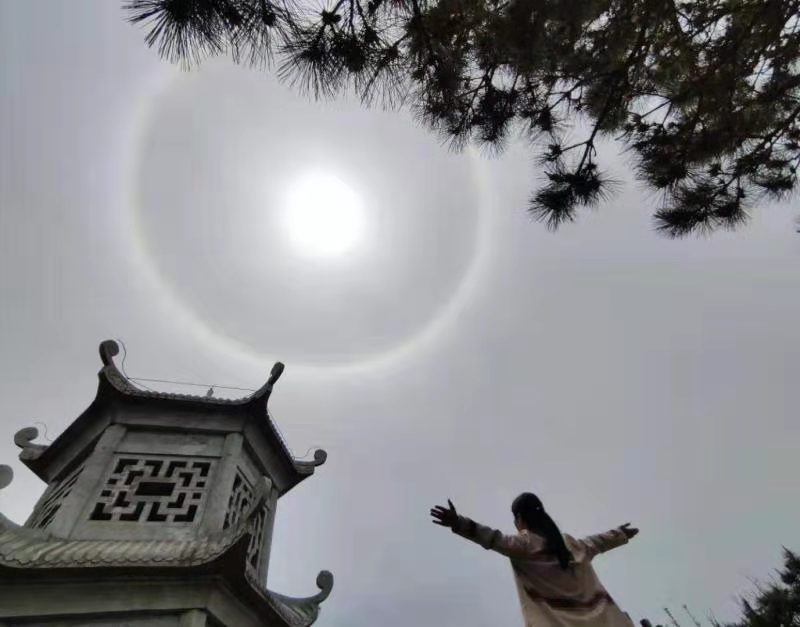 据悉,日晕是一种罕见的天象,它的出现,往往预示天气要有一定的变化。(视频/文兰 图/文兰、周翔宇、青石 )