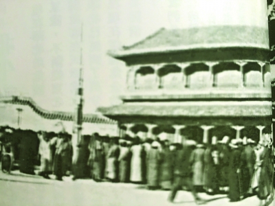 “一二·九”当天,北平爱国学生在新华门前,要求政府出兵抗日。