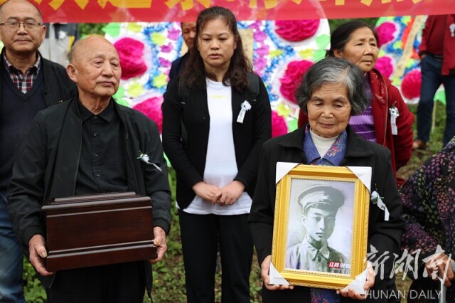 4月23日12时许,石门县蒙泉镇两河口村,红色的壮歌回荡在青山绿水之间。烈士蔡晴川后裔,从广东梅州市大埔县三河坝战役纪念园捧回一抔黄土,让他魂归故里,落叶归根。孙女蔡玉翠双手捧着爷爷的遗像走在最前面。闻讯赶来的乡亲们簇拥着,把烈士蔡晴川送上胡家山,与长眠在这里的妻子胡春姑合葬。