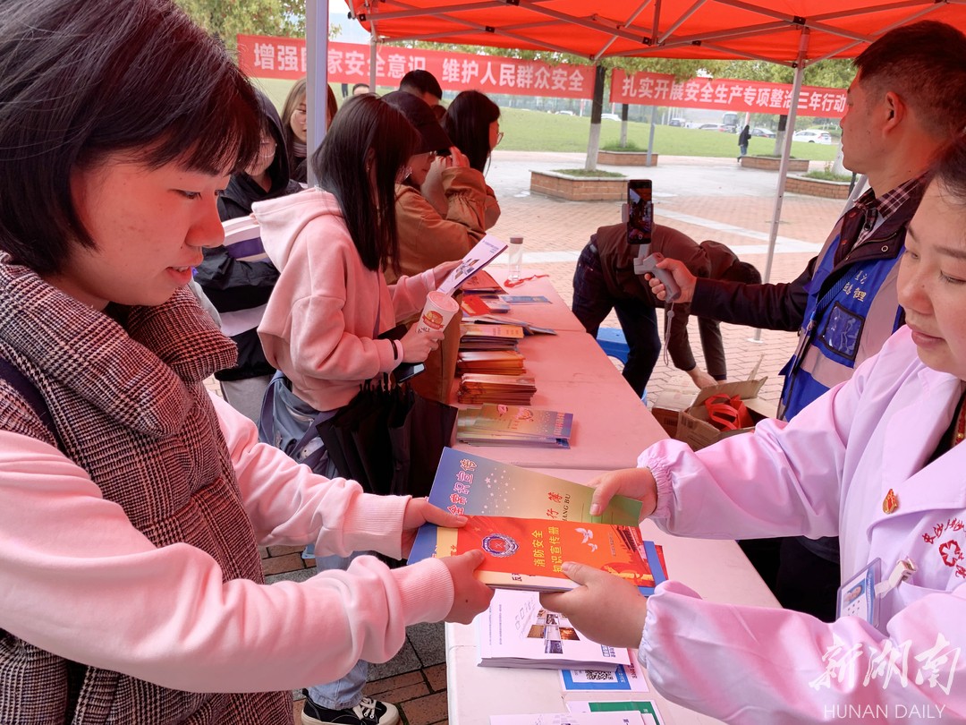 4月15日,是第6个全民国家安全教育日,长沙县安沙镇镇政府工作人员和志愿者们走进长沙师范学院开展国家安全教育进校园活动,志愿者们通过宣传横幅、海报、展板、发送宣传资料等形式向广大师生普及国家安全、反邪教等知识。邓东京 江文 摄影报道