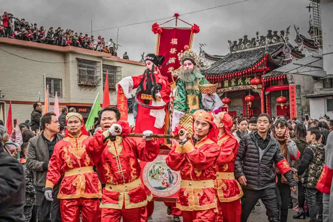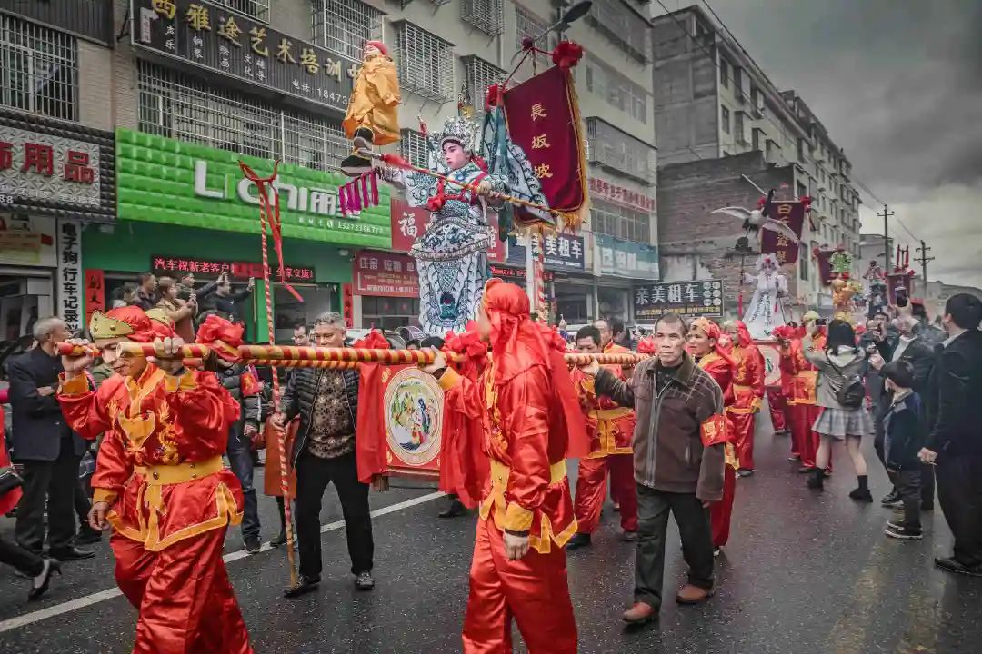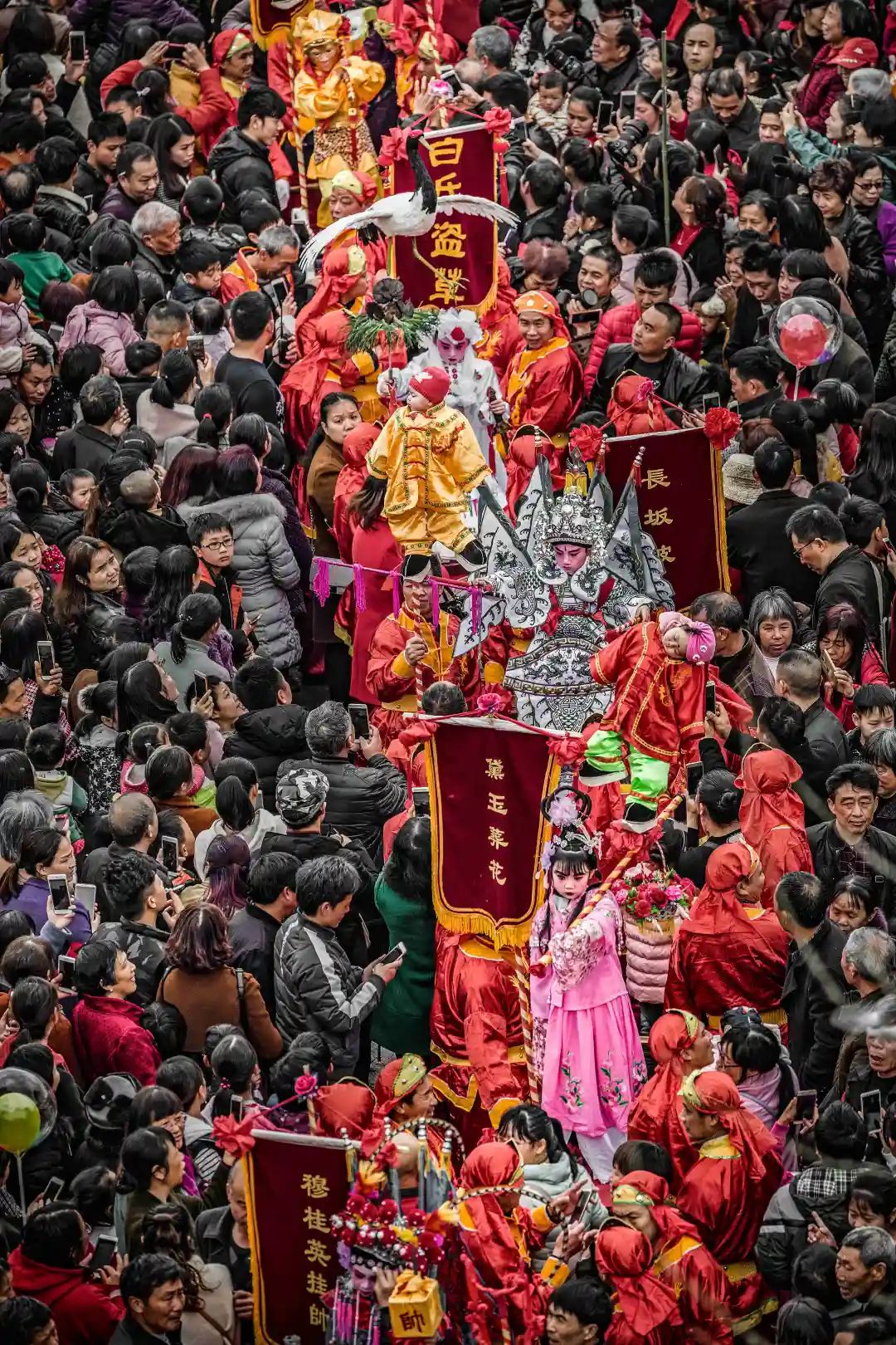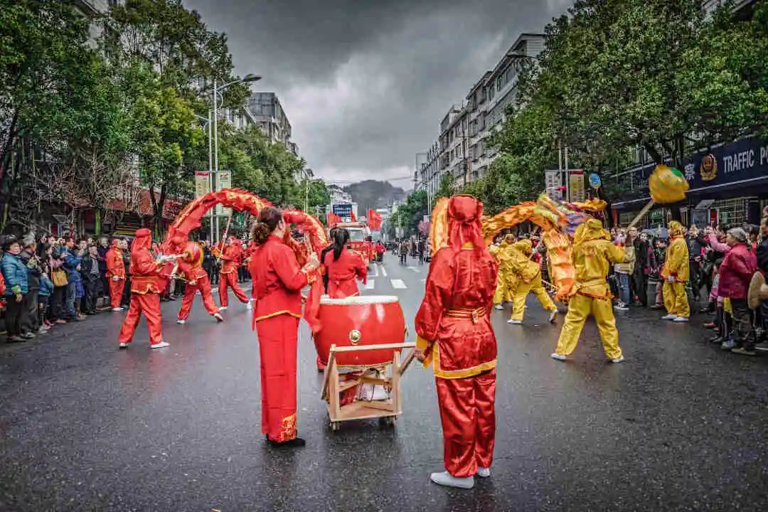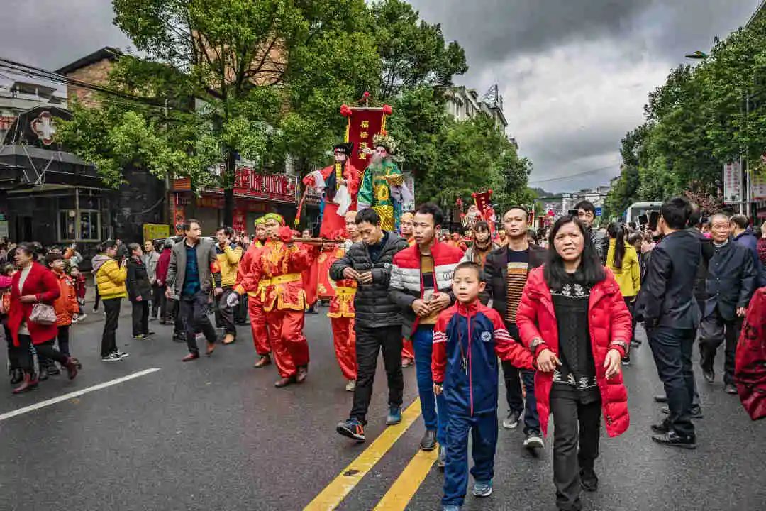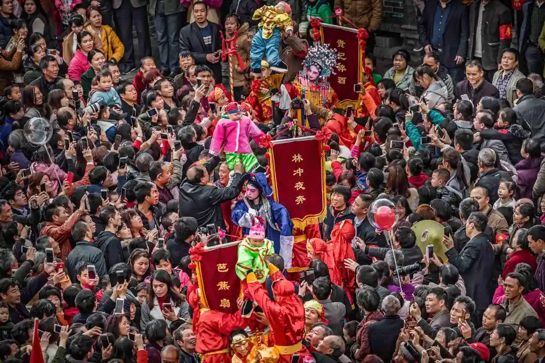 “装故事”队伍走街串巷,它们一路还配有舞龙、吹打乐队、腰鼓队等,由金龙开道,所到之处人山人海,腰鼓声、欢笑声、喝彩声响成一片。