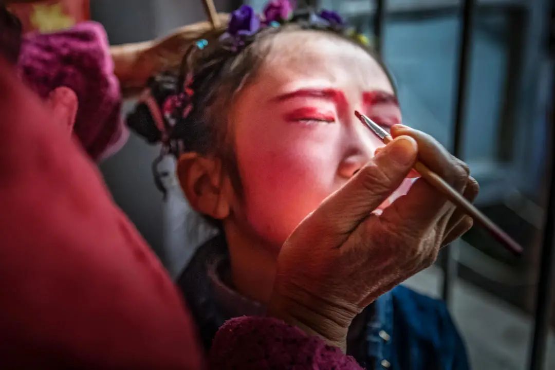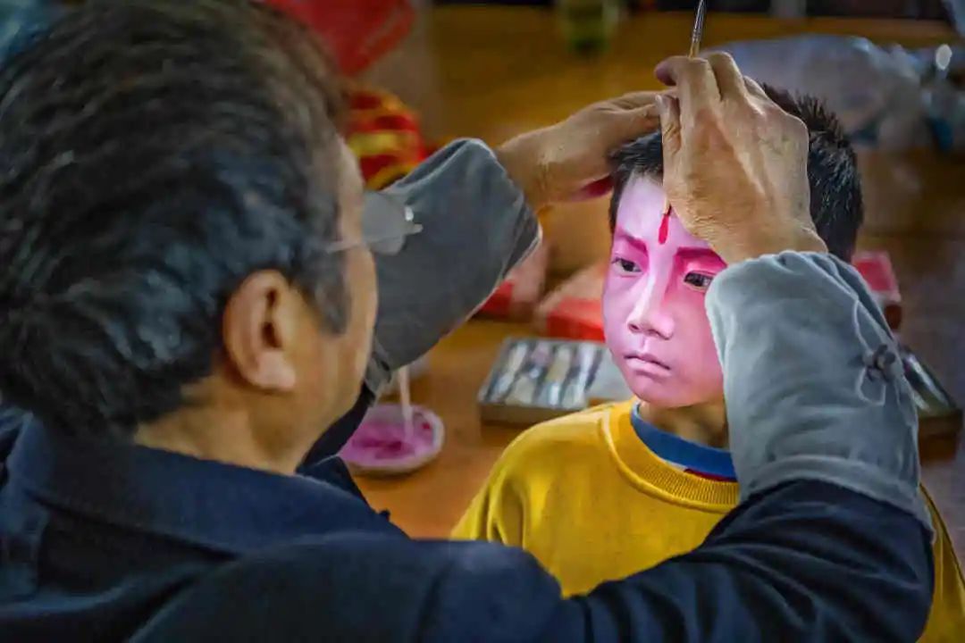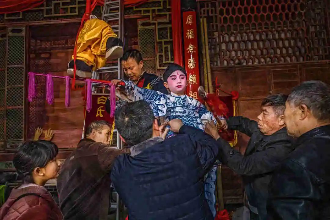 当天天一亮,汝城县卢阳镇益道村参加演出的小孩穿上戏服,由化妆师画上武松、孙悟空等人物脸谱。上午9时许,表演队伍从村中出发,“装故事”拉开大幕。