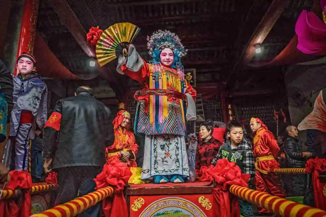 每台“故事”会设置一个“故事”架,“故事”扮演的人选均从本村小孩中挑选。小孩穿着各式各样的戏服,扮演帝王将相、才子佳人等故事戏的主角,然后由四个大人抬起游街庆贺。
