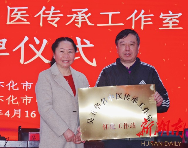 湖南日报·新湖南客户端4月19日讯(通讯员 朱丽兰)传承中医药文化,推动中医肿瘤专科发展,4月16日上午,湖南省名中医传承工作室授牌仪式在怀化市中医医院举行,湖南省中医药研究院附属医院党委委员、副院长吴玉华教授,肿瘤大科主任、肿瘤研究室主任蒋益兰教授分别将“名中医传承工作室怀化工作站”的牌子授予怀化市中医医院。