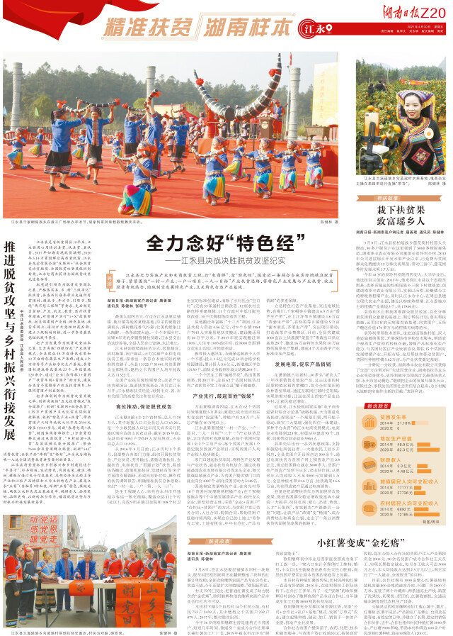 江永县创新精准扶贫方式,因地制宜、因村施策、因户施法,大力实施产业和电商扶贫工程,探索出一条符合本地实际的精准脱贫路子,全县13322户51401名贫困群众全部脱贫,建档立卡贫困户人均年纯收入达11322元。