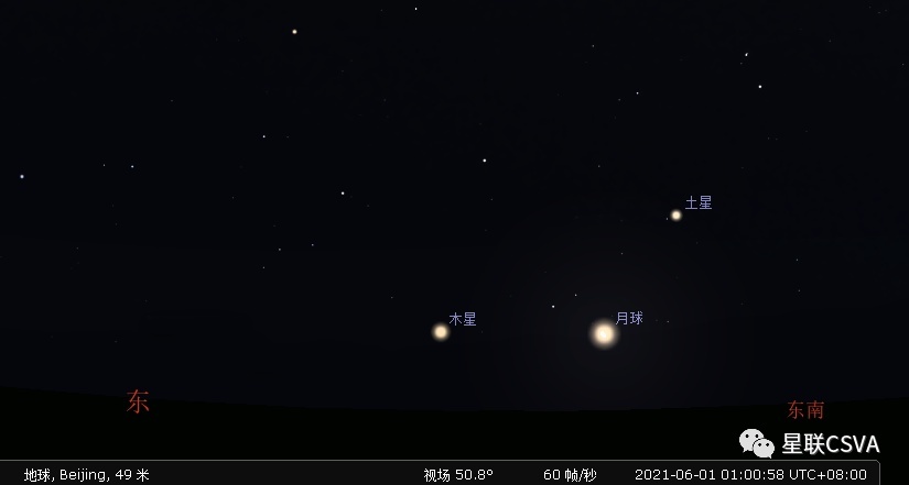 1.6月1日,木星合月。北京最佳的观测时段是1日凌晨1点至天亮。届时,我们会肉眼看到月亮两侧美丽的木星(左)与土星(右)。示意见下图: