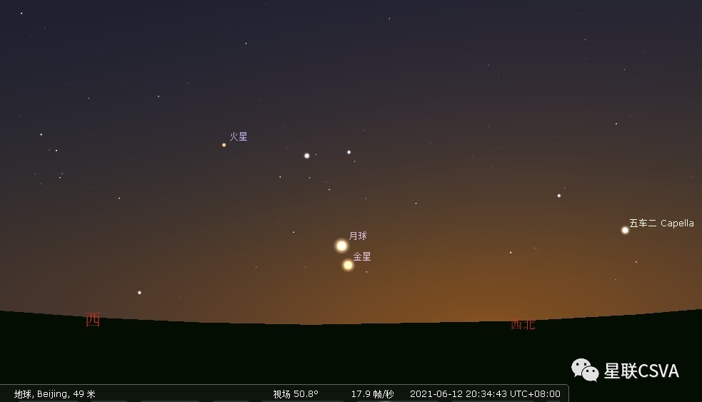 4.6月12日,金星合月。日落后可见。借助小型双筒望远镜,效果会更佳哦!示意见下图: