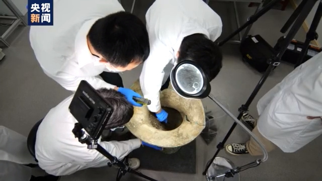 三星堆遗址3号坑发掘负责人、上海大学文学院讲师 徐斐宏:圆口方尊也我们坑里的一个明星文物,之前属于我们坑的一个北部偏东的位置。但是提出来之后我们发现,它的下半部分被压扁了,变形还是很厉害的,它器腹里面的海贝很多都露了出来,所以你会看到圆口方尊下面有很多白色的海贝。
