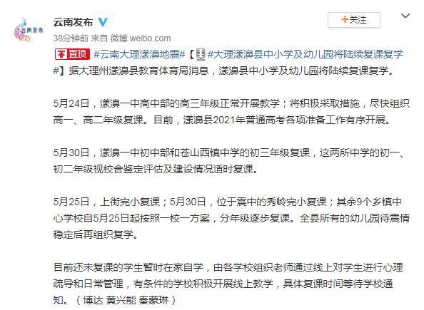 据大理州漾濞县教育体育局消息,漾濞县中小学及幼儿园将陆续复课复学。