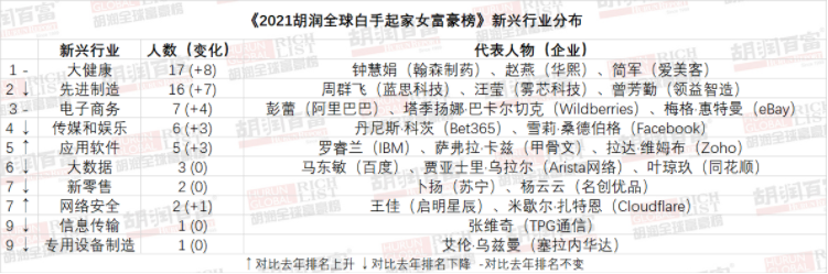 值得关注的是,从事新兴行业的比例创历史新高。全球白手起家女企业家中,从事新兴行业的比例今年增至45%,比去年增加12个百分点,这一比例高于全球富豪榜;从事传统行业的占比55%。新兴行业上榜企业家中,来自大健康和先进制造业的人数最多,分别有17位和16位,比去年增加了8位和7位。排在大健康行业首位的是翰森制药的钟慧娟,其次是华熙的赵燕。排在先进制造业首位的是蓝思科技的周群飞,其次是雾芯科技的汪莹。