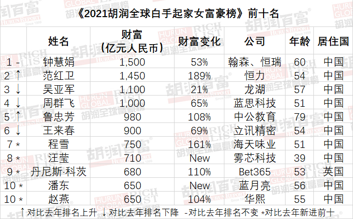榜单显示, 60岁的钟慧娟以1500亿元人民币的财富连续第二年成为全球最成功女企业家,财富比去年增长53%;范红卫以1450亿元人民币的财富位列第二,比去年上升4位,财富比去年增长189%;57岁的吴亚军以1100亿元人民币的财富位列第三,比去年下降1位,财富比去年增长21%;51岁的周群飞以1000亿元人民币的财富位列第四,财富比去年增长65%;79岁的鲁忠芳以980亿元人民币的财富位列第五,比去年上升4位,财富比去年翻一倍;54岁的王来春以900亿元人民币的财富位列第六,比去年下降2位,财富比去年增长69%;51岁的程雪以750亿元人民币的财富首次进入前十,比去年上升7位,位列第七,财富比去年增长161%;39岁的汪莹以710亿元人民币的财富首次上榜,位列第八;53岁的丹尼斯·科茨(Denise Coates)以680亿元人民币的财富首次进入前十,比去年上升2位,位列第九,财富比去年翻一倍;56岁的潘东以650亿元人民币的财富首次上榜,位列第十;55岁的赵燕以650亿元人民币的财富首次进入前十,比去年上升2位,位列第十,财富比去年翻一倍。