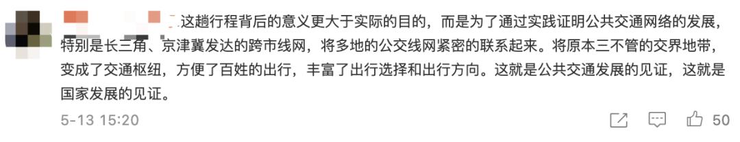 “特别是长三角、京津冀发达的跨市线网,将多地的公交线网紧密地联系起来,原本‘三不管’的交界地带,变成了交通枢纽,方便了百姓的出行,丰富了出行选择和出行方向。这就是公共交通发展的见证,这就是国家发展的见证。蓬勃的工业化和现代化的发展,公交体系的发展,城市和农村的衔接,这是伟大祖国的伟大成就。”