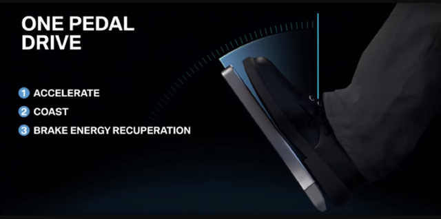 单踏板模式,顾名思义是靠一个加速踏板完成车辆的加速和制动操作,松开踏板车辆就会开始明显的制动,当然遇到需要大幅减速的情况仍然需要右脚踩刹车,但这样就无法像燃油车那样松油门“溜车”。