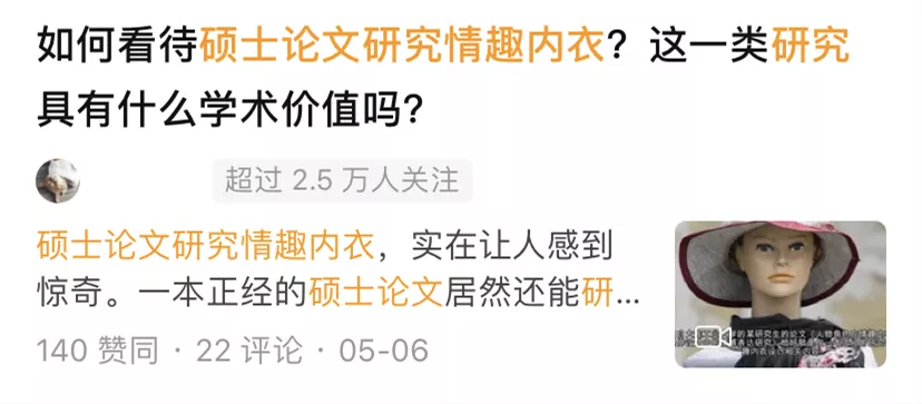 近日,知乎、豆瓣、微博等互联网平台上,不少网友为一篇题为《人物角色在情趣内衣延伸设计中的情感表达研究》的硕士论文吵翻了,如何看待“硕士论文研究情趣内衣”成为网友热议焦点。